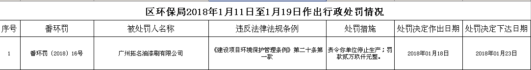 區環保局2018年1月11日至1月19日作出行政處罰決定書