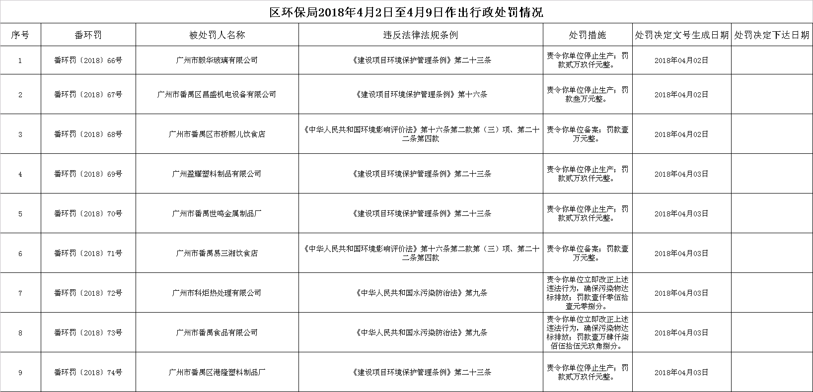 區(qū)環(huán)保局2018年4月2日至4月9日作出行政處罰情況決定書