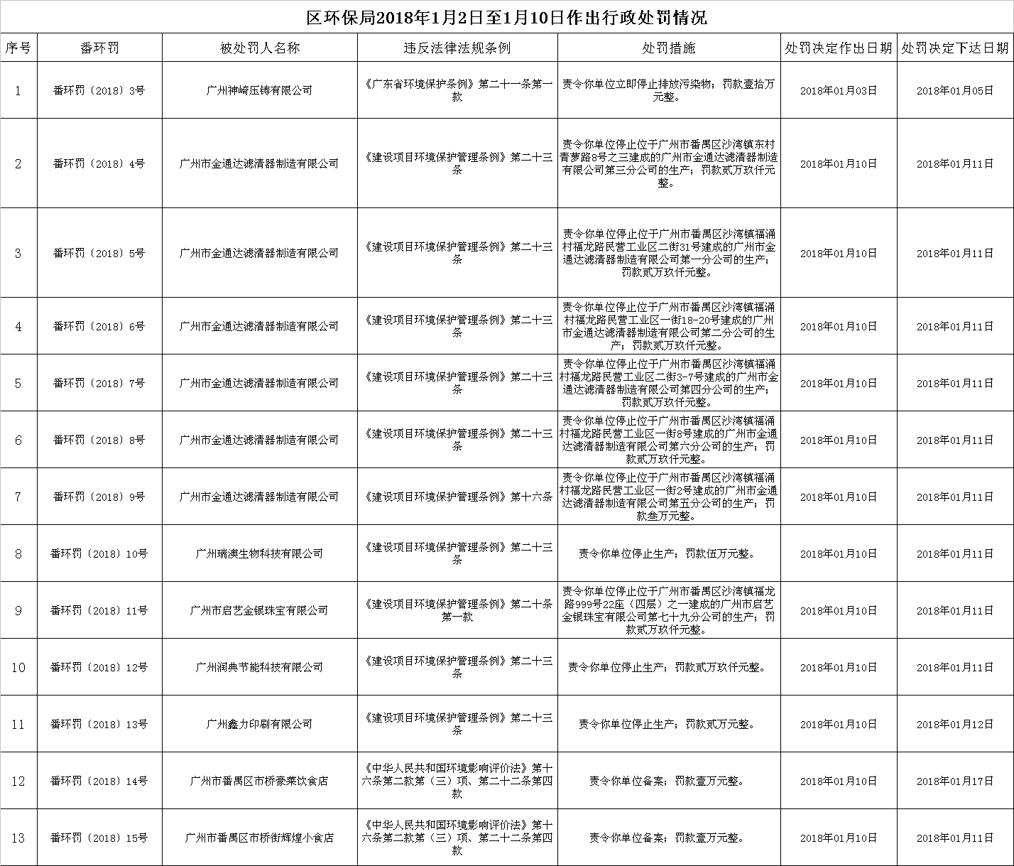 區(qū)環(huán)保局2018年1月2日至1月10日作出行政處罰決定書