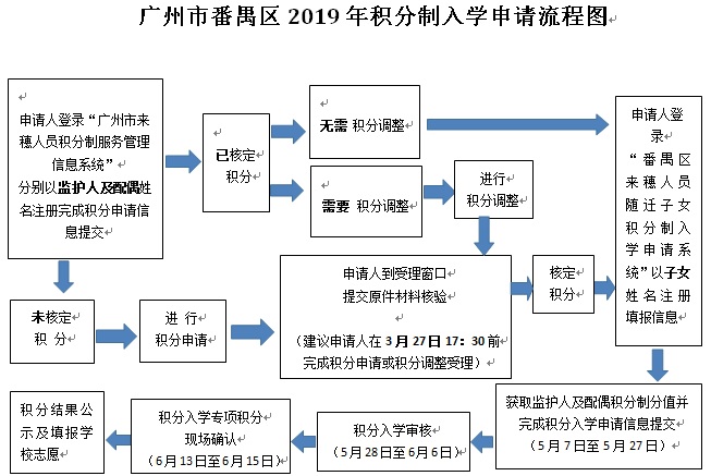 根據《外來務工人員子女在番禺區接受義務教育實施辦法的通知》(番府辦〔2015〕2號,以下簡稱《實施辦法》)和《廣州市人民政府辦公廳關于進一步做好來穗人員隨遷子女接受義務教育工作的實施意見》(穗府辦函〔2016〕174號)、《廣州市教育局 廣州市來穗人員服務管理局關于落實來穗人員隨遷子女接受義務教育實施意見有關工作的通知》(穗教基教一〔2017〕4號)等有關規定,結合《廣州市人民政府關于印發廣州市來穗人員積分制服務管理規定(試行)的通知》及其實施細則的精神,現開展番禺區2019年來穗人員隨遷子女積分制入學工作。有關規定如下: