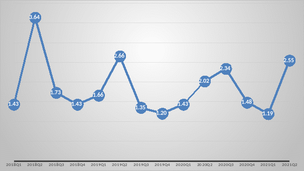 2021年第二季度,用工需求人數與求職人數的比率(求人倍率)為2.55,同比上升0.53,即從去年同期平均2.02個崗位對應1名求職者,上升到本季度平均2.55個崗位對應1名求職者。