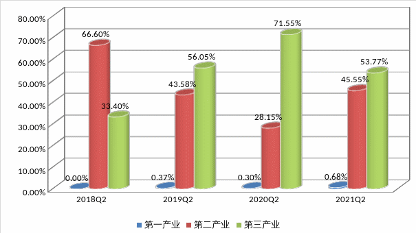 2021年第二季度,第一產業用工需求比例為0.68%,同比上升0.38%;第二產業用工需求比例為45.55%,同比上升17.40%;第三產業用工需求比例為53.77%,同比下降17.78%。