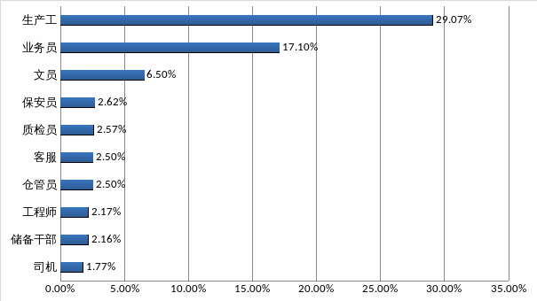 2021年第二季度,用人單位需求較大排名前三位的工種為生產工、業務員、文員,分別占工種總需求的29.07%、17.10%、6.50%,其中生產工的需求同比上升10.07%,業務員的需求同比下降5.20%,文員的需求同比上升1.37%。