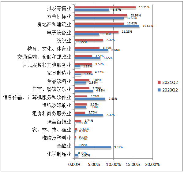 2021年第二季度,批發零售業、五金機械業、房地產和建筑業占用工需求的前三位。從圖1-4中可以看出,用工需求同比變化較大的行業有:紡織業,同比上升7.08%;批發零售業,同比上升6.74%;電子設備業,同比上升4.94%;金融業,同比下降9.10%;信息傳輸、計算機服務和軟件業,同比下降4.67%;租賃和商務服務業,同比下降4.60%;房地產和建筑業,同比下降4.04%。