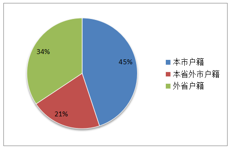 2021年第二季度,求職人員有10023人,其中,本市戶籍占比45%,環比上升13%;本省外市戶籍占比21%,環比下降7%;外省戶籍占比34%,環比下降6%。