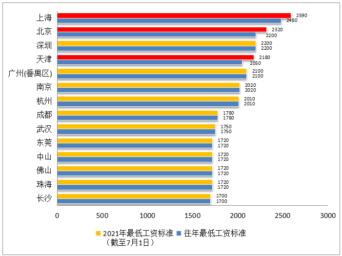 2021年第二季度,十四個重點城市的企業最低工資標準,上海市為2590元/月,同比提高了4.44%;北京市為2320元/月,同比提高了5.45%;天津市為2180元/月,同比提高了6.34%;其他地區不變。番禺區企業最低工資標準為2100元/月,非全日制職工小時最低工資標準為20.3元/小時。