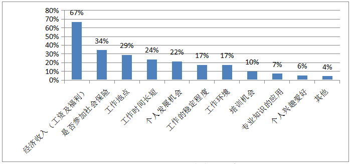 2021年第二季度,求職者求職主要考慮以下因素:經濟收入(工資及福利),有67%求職者選擇,環比上升28%;是否參加社會保險,有34%求職者選擇,環比上升12%;工作地點,有29%求職者選擇,環比上升16%;工作時間長短,有24%求職者選擇,環比上升4%;個人發展機會,有22%求職者選擇,環比上升12%。