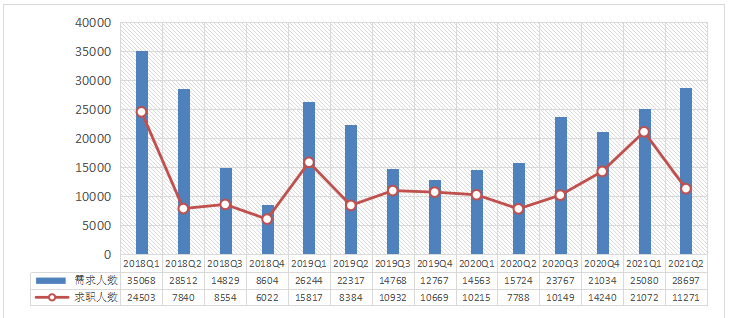 2021年第二季度,用人單位登記招聘各類人員28697人次,同比增加82.50%。求職人數為11271人次,同比增加44.72%。