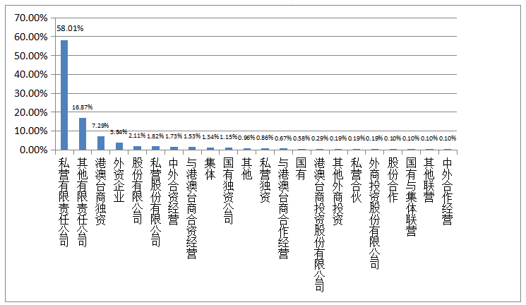 2021年第二季度,我區1043家“四上”企業中,私營有限責任公司占比58.01%%,其他有限責任公司占比16.87%,港澳臺商獨資公司占比7.29%,其他登記注冊類型公司占比均比較少。