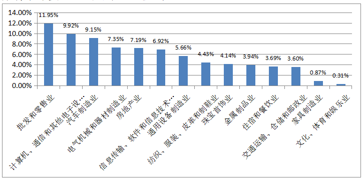 2021年第二季度,14個行業中用工量占比排名前三的是批發和零售業,計算機、通信和其他電子設備制造業,汽車制造業,分別占用工總量的11.95%、9.92%、9.15%。用工量最少的是文化、體育和娛樂業,占用工總量的0.31%。