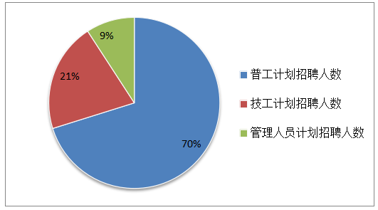 2021年第二季度,企業計劃招聘總人數為14498人,環比增加了5.56%。計劃招聘總人數與在崗總人數的比為8.58%,環比增加了0.28%。普工、技工、管理人員分別占計劃招聘總人數的比例為70%、21%、9%。