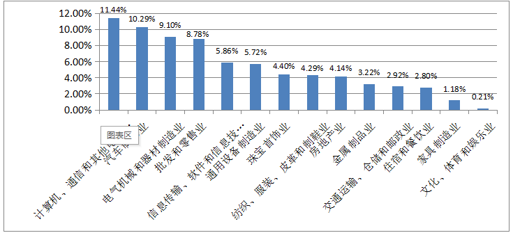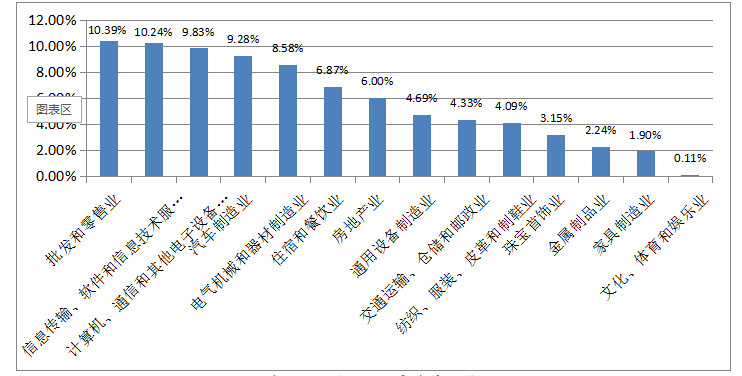 14個行業中,每個行業流失人數占流失總人數比例排名前四的是批發和零售業,信息傳輸、軟件和信息技術服務業,計算機、通信和其他電子設備制造業,汽車制造業,分別占比10.39%、10.24%、9.83%、9.28%;占比最低的是文化、體育和娛樂業,只有0.11%。