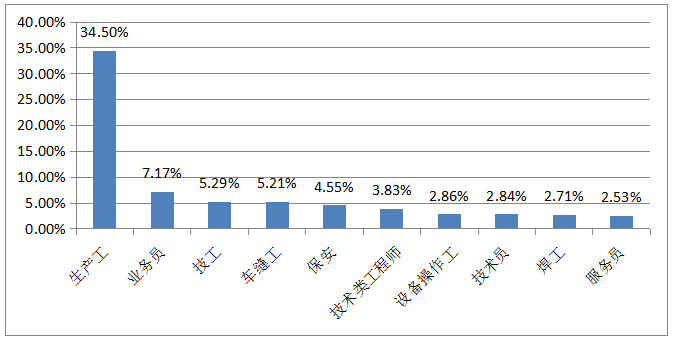 企業緊缺的職位總人數有7698人,其中排名前三的是生產工、業務員、技工,分別占比34.50%、7.17%、5.29%。