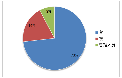2.企業總體缺工率為4.72%,普工的需求量較大。缺工人數排名前三的行業是計算機、通信和其他電子設備制造業,汽車制造業,電氣機械和器材制造業。