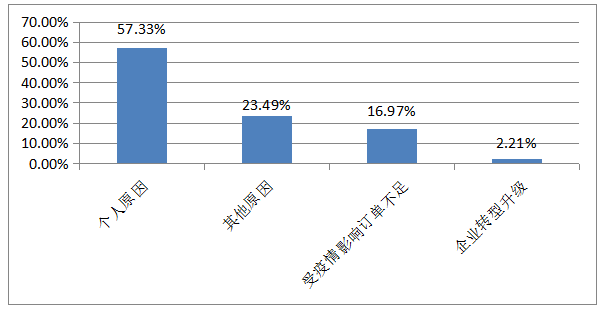 企業人員流失原因選“個人原因”的有57.33%,選“其他原因”的有23.49%,選“受疫情影響訂單不足”的有16.97%,選“企業轉型升級”的有2.21%。造成人員流失的主要是員工個人原因,受疫情影響造成人員流失的占比較小,由此可見企業經營總體情況較穩定。