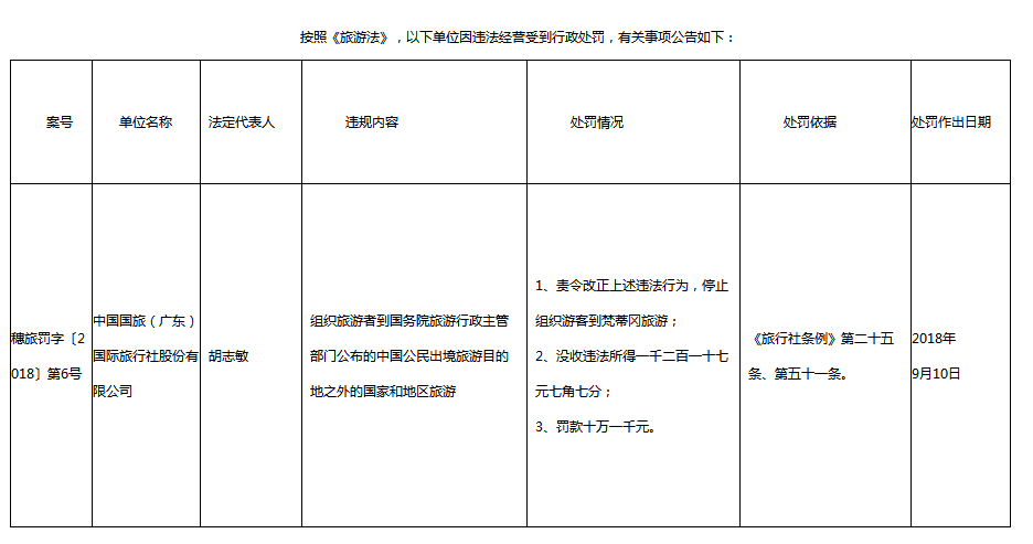 違法經營旅游業務行為公告2018年第6號